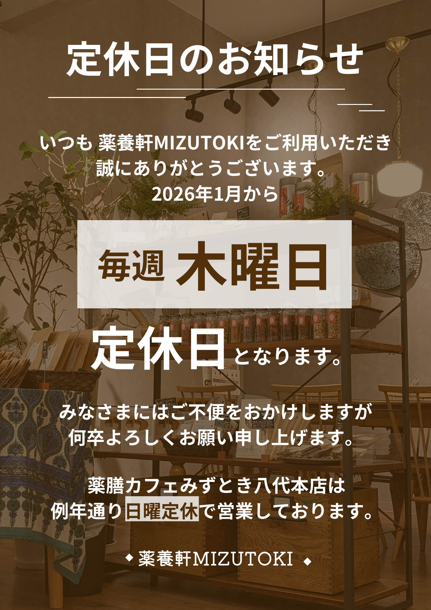NEWS お知らせ 薬養軒MIZUTOKI定休日のお知らせ 2026年01月06日 お知らせ 平素より格別のお引き立てを賜り、厚く御礼申し上げます。 誠に勝手ながら、薬養軒MIZUTOKIは 2026年1月から、毎週木曜日を定休日とさせていただくことになりました。 カフェ2店舗の定休日が店舗ごとに異なりますのでご注意ください。 【八代本店】 毎週日曜日 【薬養軒MIZUTOKI】 毎週木曜日 ご不便をおかけいたしますが、 ご理解のほどよろしくお願いいたします。 CATEGORY: すべて 採用情報イベントお知らせ 前へ 一覧へ戻る